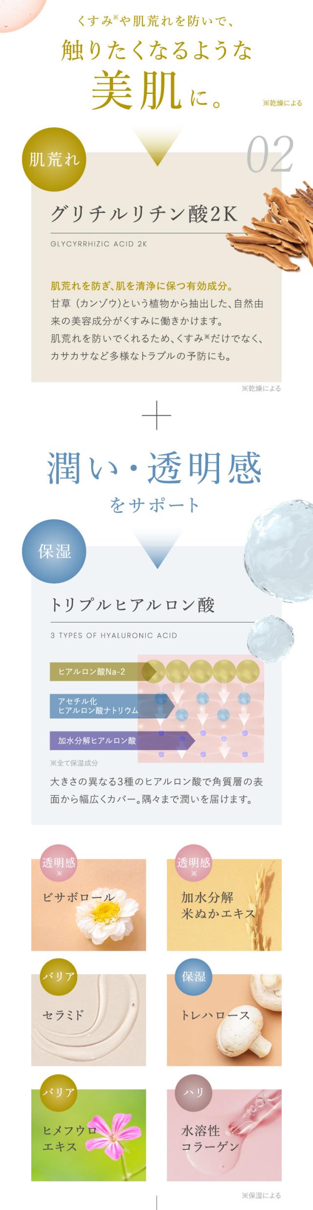 | その他の成分 | ビサボロール、3-O-エチルアスコルビン酸、米糖抽出物水解液A、アセチル化ヒアルロン酸ナトリウム、加水分解ヒアルロン酸、ヒアルロン酸Na-2、水溶性コラーゲン液-4、ヒメフウロエキス、酵母多糖体末、プルーン酵素分解物、スターフルーツ葉エキス、アーティチョークエキス、セイヨウナシ果汁発酵液、カモミラエキス-1、ステアロイルフィトスフィンゴシン、トレハロース、天然ビタミンE、エチルヘキサン酸セチル、トリメチルグリシン、濃グリセリン、キサンタンガム、ステアリン酸POE(20)ソルビタン、ジメチコン、BG、カルボキシビニルポリマー、1,2-ペンタンジオール、水酸化K、フェノキシエタノール、ジラウロイルグルタミン酸リシンナトリウム液、水添大豆リン脂質 |