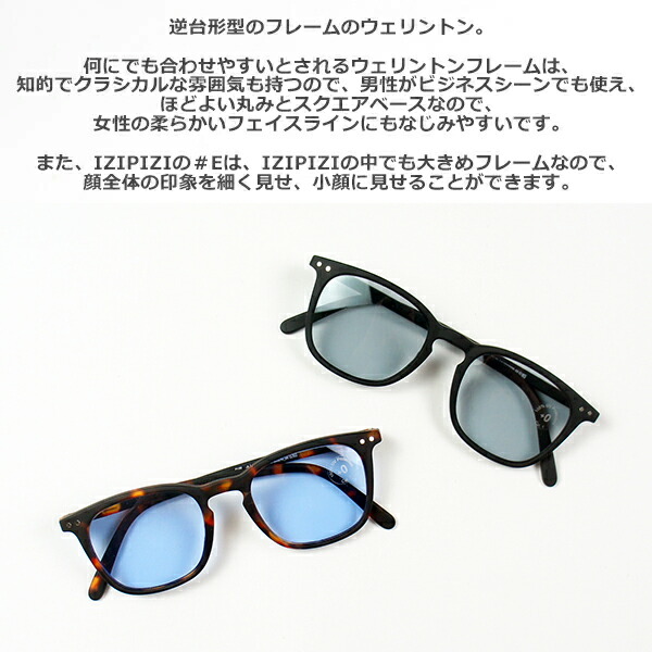 THE TRAPEZE SHAPE【台形】 逆台形型のフレームのウェリントン。 何にでも合わせやすいとされるウェリントンフレームは、知的でクラシカルな雰囲気も持つので、 男性がビジネスシーンでも使え、ほどよい丸みとスクエアベースなので、 女性の柔らかいフェイスラインにもなじみやすいです。 また、IZIPIZIの#Eは、IZIPIZIの中でも大きめフレームなので、 顔全体の印象を細く見せ、小顔に見せることができます。 ウェリントンフレームはどんな顔型の方にも似合うため、 おしゃれアイテムとして取り入れやすく、初めてアイウェアを買うという方にもおすすめです。 | ||||||