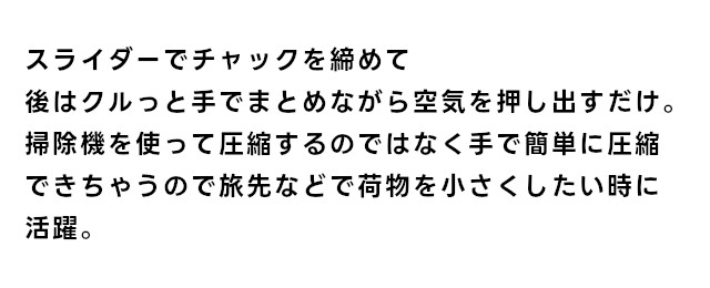 スライダーでチャックを締めて後はクルっと手でまとめながら空気を押し出すだけの簡単圧縮。 |