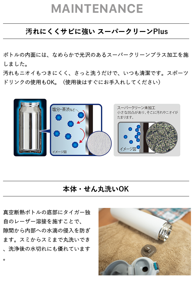 タイガー独自の加工で汚れやニオイがつきにくく、さっと洗うだけで、いつも清潔。