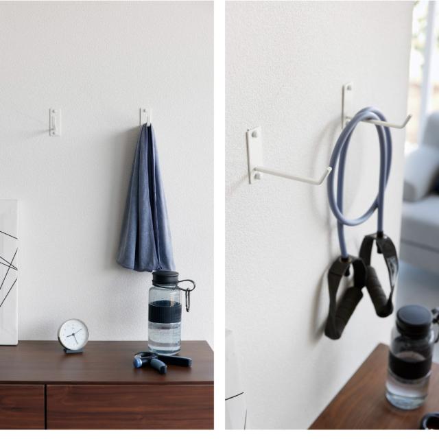 置き場所に困るヨガマットやフィットネスグッズを壁に収納。石こうボードピンで設置できるヨガマットハンガー。壁の穴が目立たない石こうボードピンで壁に取り付けられます。スペースを有効利用でき、床から浮かせて収納できるので、お掃除も楽ちん。