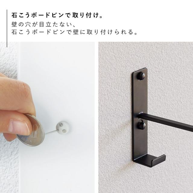 置き場所に困るヨガマットやフィットネスグッズを壁に収納。石こうボードピンで設置できるフック付きヨガマットハンガー。壁の穴が目立たない石こうボードピンで壁に取り付けられます。スペースを有効利用でき、床から浮かせて収納できるので、お掃除も楽ちん。