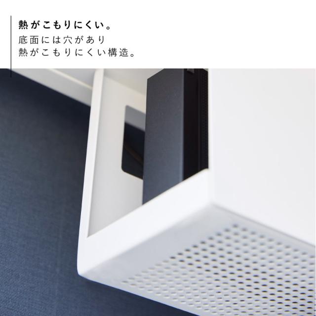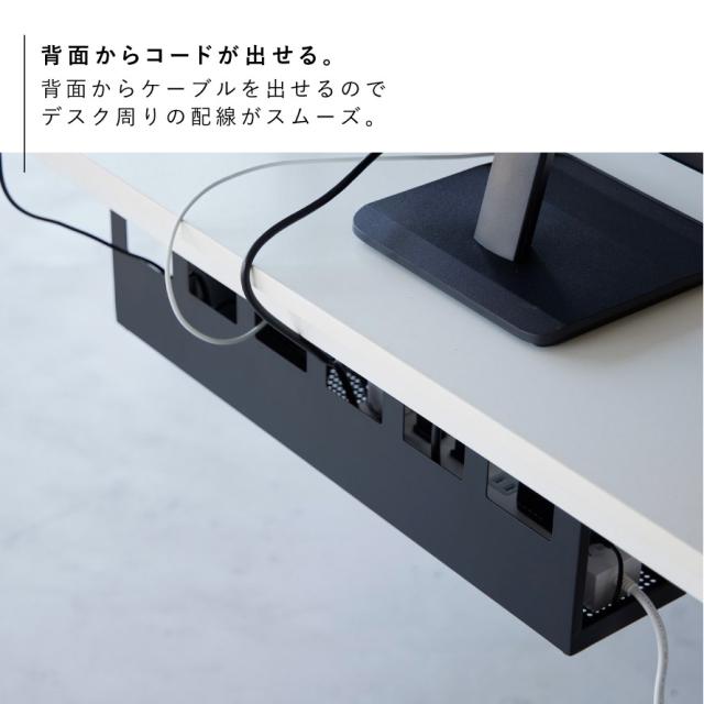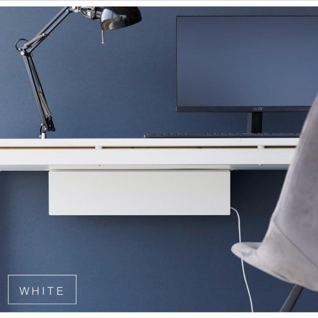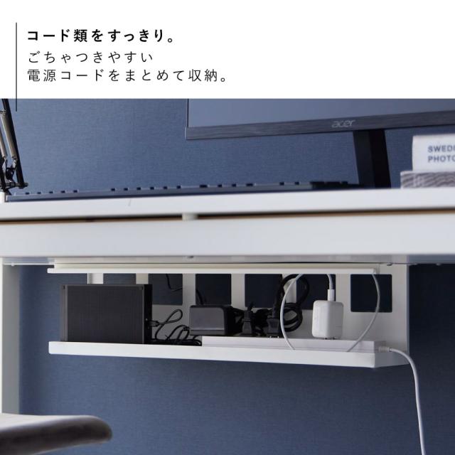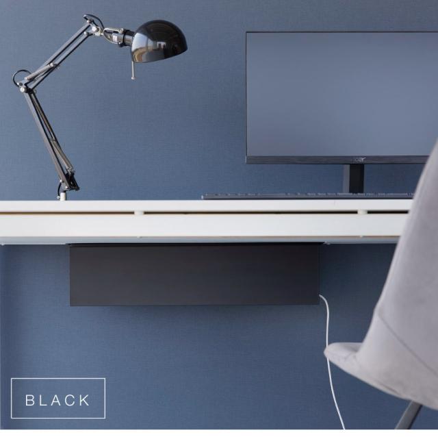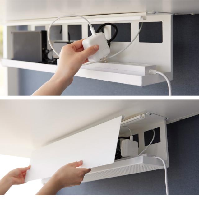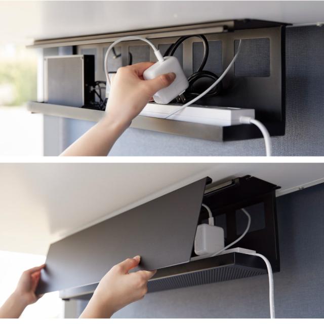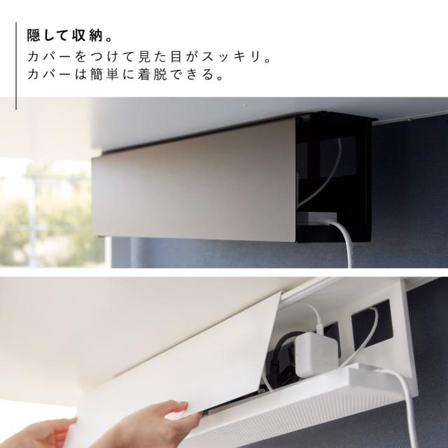 デスクの天板下に木ネジで取り付けて電源タップやACアダプター・HDDを収納できるケーブルラック。ごちゃごちゃするPC周りのコード類をまとめて収納でき、カバーをつけて見た目がスッキリ。カバーは簡単着脱です。