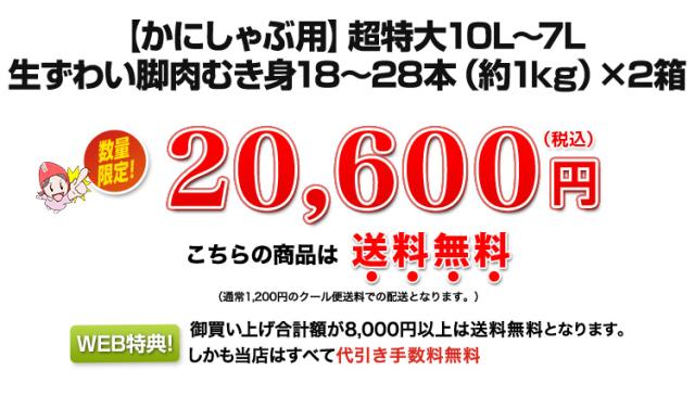 ●商品名/【かにしゃぶ用】超特大10L〜7L生ずわい脚肉むき身18〜28本(約1kg)×2箱