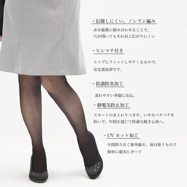 | 特徴 | メッシュ状に糸を複雑に絡み合わせて編み上げた、メッシュ編み構造となっています。 糸同士が複雑に絡み合うため、穴が開いてもそこから広がっていくのを防いでくれます(ノンラン編み・メッシュ編みなどと呼びます)。 生地がメッシュ状になっているので、伸びが良く柔らかいはき心地です。 締め付ける感覚が苦手な方には、この柔らかい感触はオススメです! メッシュ状になっているので、交編(サポート生地)に比べると、より高いカバー力があるので、脚の難点をきれいに隠しつつ、適度な素肌感が出ているストッキングです。 普段使いに嬉しい、お得な3足組み! ★サンダルの足元でもヌーディな雰囲気に。 つま先スルー ★汗をかいても安心 抗菌防臭加工 ★ヒップによりフィットして安定感があります。 ヒシマチ付き ★ボトムスのまとわりつきを防いで快適に 静電気防止加工 |