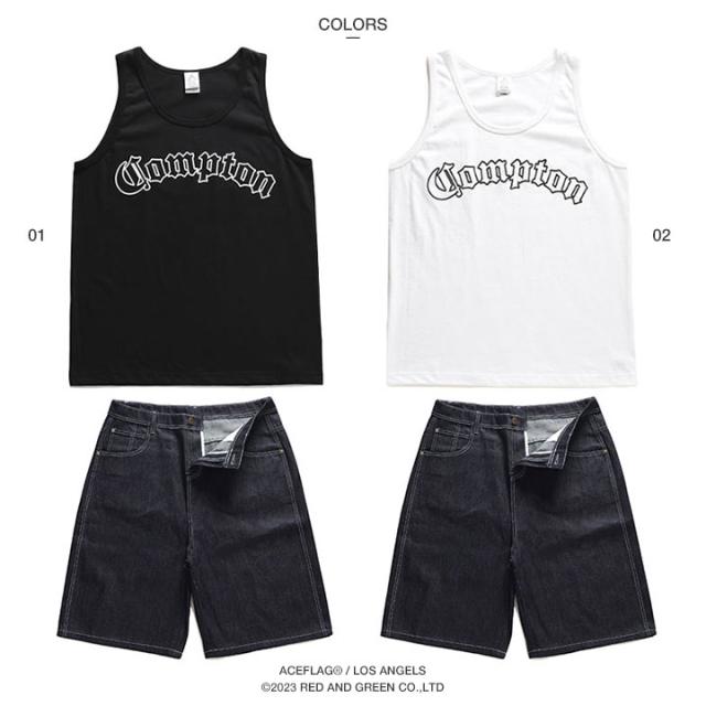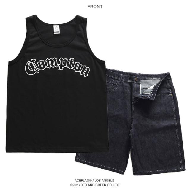 ACE FLAG 上下セット ノースリーブ Tシャツ デニム ハーフパンツ メンズ 黒/白 大きいサイズ エースフラッグ セットアップ Compton コンプトン ビッグシルエット b系 ヒップホップ ダンス ストリート系 AF-SE-TK-021
