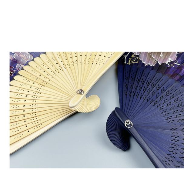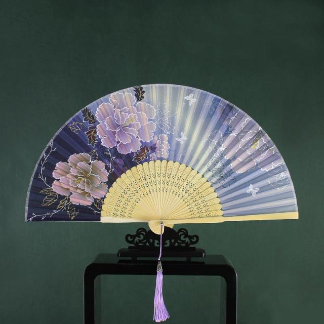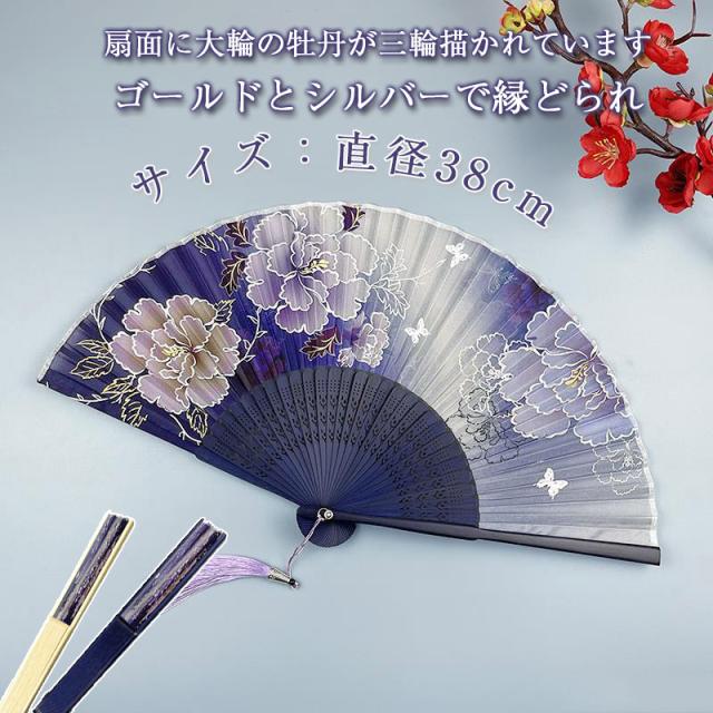 末広がりの形から、縁起物の扇子。牡丹の花言葉は、風格・富貴・・藍色のグラデーションの扇面に大輪の牡丹が三輪描かれています。ゴールドとシルバーで縁どられ、落ち着いた色合いの中に華やかさもある扇子です。