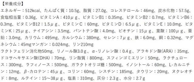 | 乳糖、調整脂肪(パーム油、パーム核油、ヒマワリ油、サフラワー油、エゴマ油)、乳清たんぱく質消化物、でんぷん分解物、カゼイン消化物、ガラクトオリゴ糖液糖、乳糖分解液(ラクチュロース)、ラフィノース、精製魚油、アラキドン酸含有油、ラクトフェリン消化物、L-カルニチン、酵母/レシチン(大豆由来)、炭酸カルシウム、塩化マグネシウム、リン酸三カルシウム、塩化カリウム、ビタミンC、炭酸ナトリウム、塩化カルシウム、リン酸水素二カリウム、コレステロール、L-チロシン、イノシトール、ピロリン酸第二鉄、炭酸カリウム、タウリン、硫酸亜鉛、シチジル酸ナトリウム、パントテン酸カルシウム、ビタミンE、ニコチン酸アミド、ウリジル酸ナトリウム、硫酸銅、5’-アデニル酸、ビタミンA、イノシン酸ナトリウム、グアニル酸ナトリウム、ビタミンB2、ビタミンB6、ビタミンB1、葉酸、β-カロテン、カロテノイド、ビオチン、ビタミンD3、ビタミンB12 |