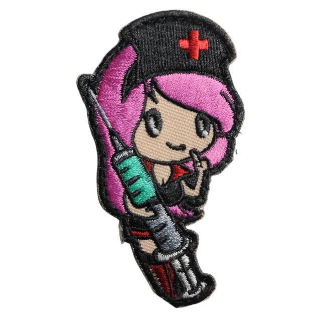 大きな注射器を持った看護師の女の子の刺繍パッチで、衛生兵やこのようなパッチを求める人達のためにデザインされています。