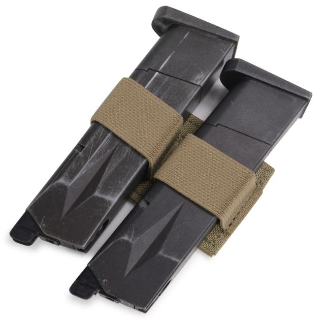 LBX Tactical(タクティカル)社製の、ハンドガン用マガジンが2本装備できる、デュアルピストルマグループです。ループ部分はゴム素材を使用しており、伸縮性が高いので、シングルカラムやダブルカラムといったサイズを選ぶことなく、ほぼすべてのタイプのハンドガンマガジンに対応しています。