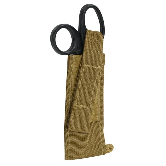 軍用として使われる医療ハサミを携行する際に使用します。ハサミの指穴にベルクロストラップを通して固定することで、活動中にハサミが脱落するのを防止します。本体裏にはマリスクリップが付属しておりPALSウェビングなどに装着が可能。※本商品にハサミは付属しません。
