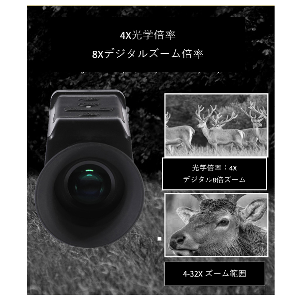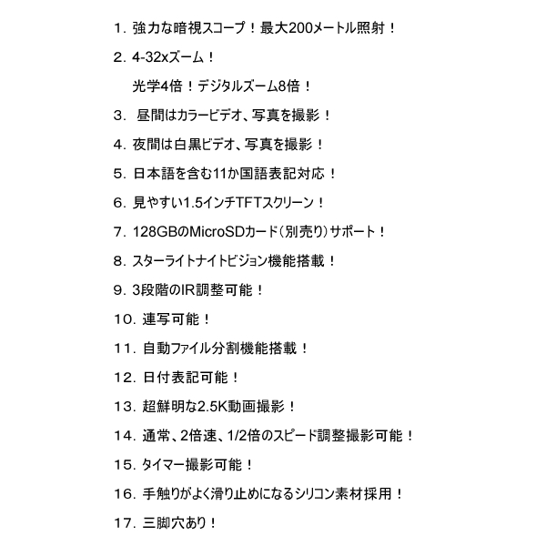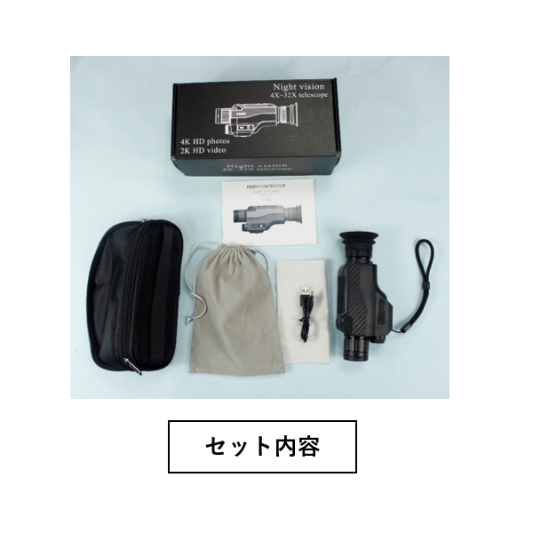 ■光学倍率4倍 ■デジタルズーム:8倍 ■接眼調整範囲: 0.5 ■画面:内蔵 1.5 インチ LCD IPS 画面解像度 360*240 ■視野: 10.4° ■レンズ:32mm 30fps ■イメージセンサー:CMOS ■赤外線距離(完全な暗闇):2〜200m ■IR LED::850nm 3W Infared LED ■写真: 40M。30M、25M、20M、10M、8M、5M,3M /JPG 形式 ■ビデオ:2.5K UHD、1080FHD、1080P、720P /AVI形式 ■バッテリー: 内蔵充電式 リチウム電池 3.7V 700mAh ■最大128GBのマイクロSDカード(別売り)をサポート ■USB ポート: マイクロ USB 2.0 ■セット:本体、USBケーブル、専用バッグ、ストラップ、レンズクロス、取扱説明書兼保証書 ■保証:1年 ■製造:中国 ※記載は商品仕様の一部です。仕様説明不足等の理由での返品はできません。特に適合等は必ずご確認ください。