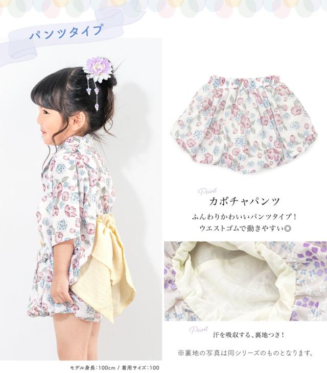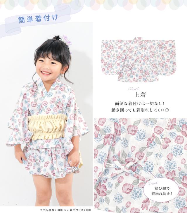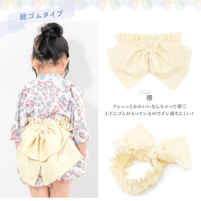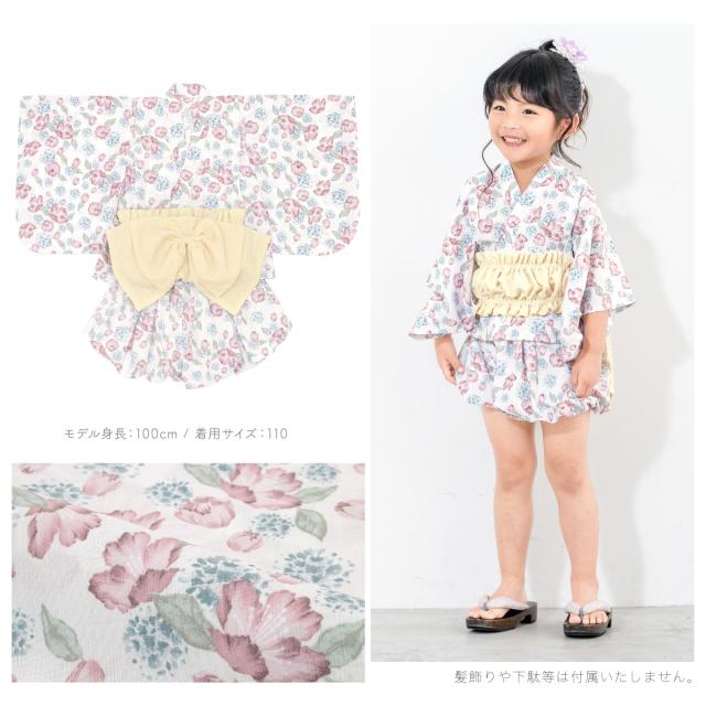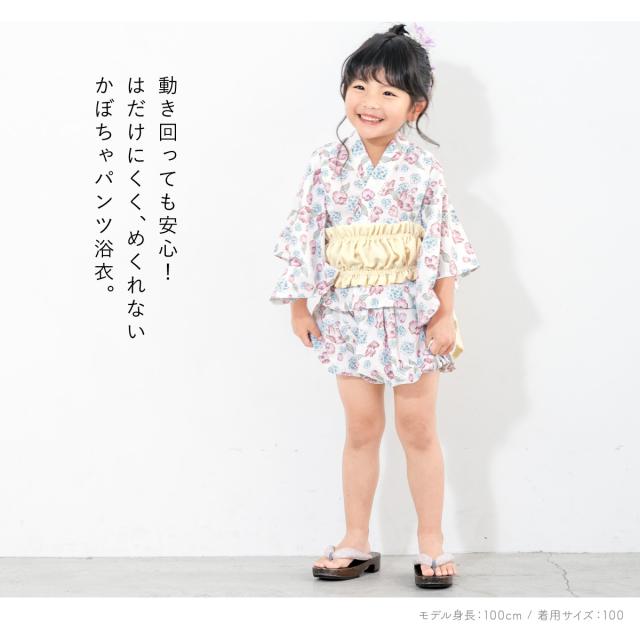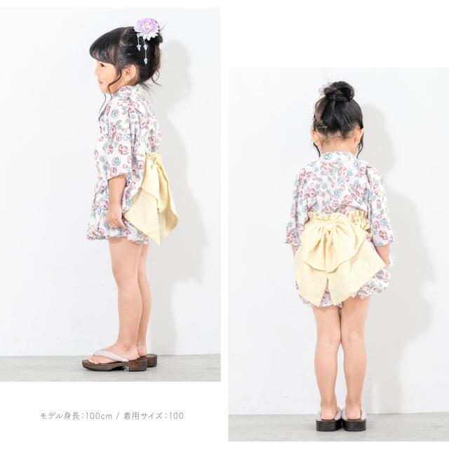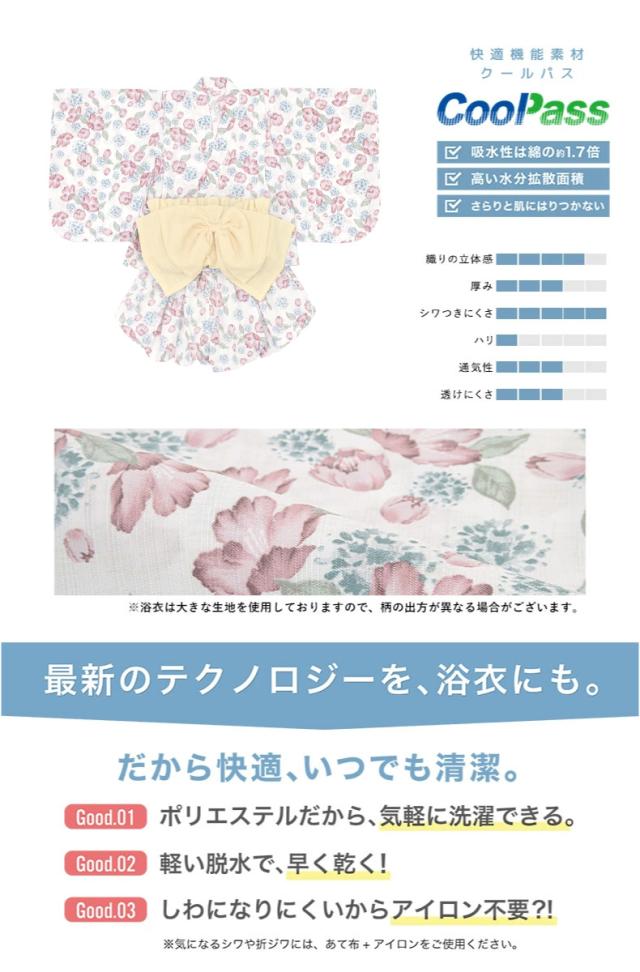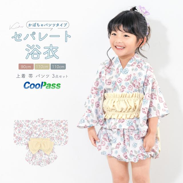 浴衣 子供 セパレート 女の子 ベビー 浴衣セット かぼちゃパンツ 帯 3点セット SOUBIENオリジナル 吸水速乾 CoolPass モダン 白 ピンク 水色 クリーム ポピー 90 100 110 送料無料