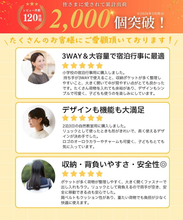 - 修学旅行用にカバンを探していました。カバンを地面に置くこともあるので底鋲があればとても良かったのですが、中.高生と長く使える用にシンプルでもピンクがポイントになって女の子らしさもあるデザイン、3Wayになるところが決めてとなりました。ポケットもたくさんあって使いやすそうです。小6の娘は最近おしゃれが大好きでかなりこだわりがあるのですがとても可愛いと気に入っています。まだ身長が135センチしかないので大きめですがカバン自体が軽いので問題なさそうです。撥水加工になっているとは思いますが念の為、防水スプレー触ったほうが汚れにくくなるとかより安心なのかな。良いものを大事に長く使ってくれるといいな。