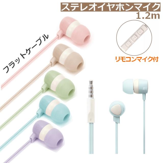 マイク付ステレオイヤホン 3.5mmステレオプラグ フラットケーブル 1.2m イヤホンマイク リモコン付き 通話ができる 耳栓タイプ イヤフォン メール便送料無料
