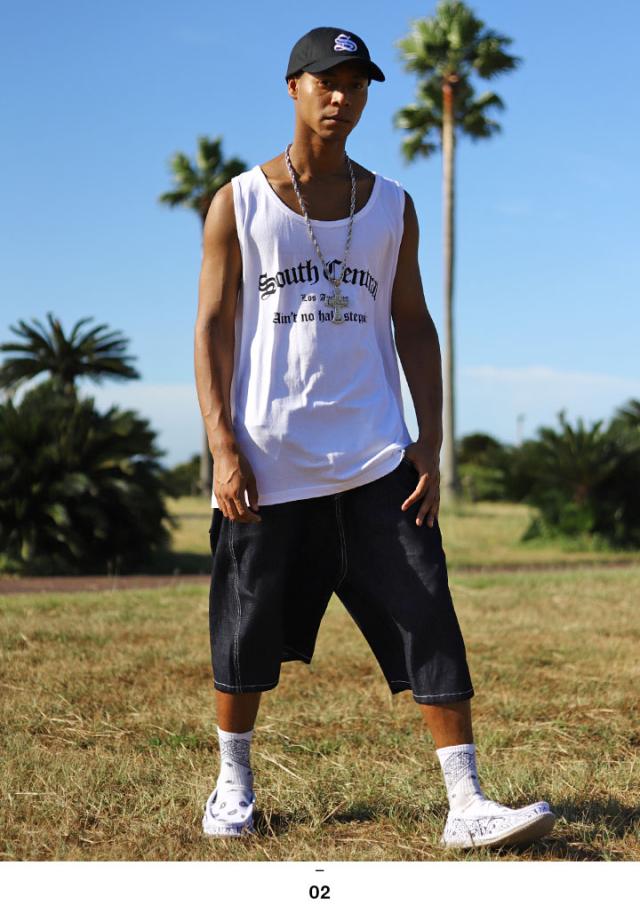 フロントに、アーチロゴで「South Central」をドロップした(上)がタンクトップ、(下)がデニムハーフパンツの上下セット。