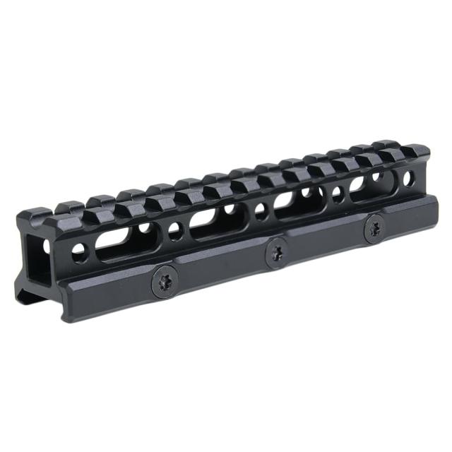 ドットサイトなどの光学機器と、銃本体のトップレールの間にこちらを挟み込むことで、通常より高い位置に照準器をセッティング。ユーザーの目線やゴーグルなどの装備に合わせた最適な高さに設定することで、より素早く確実なサイティングが可能になります。また、PEQなどのデバイスをフロントへ装着している場合にも有効です。