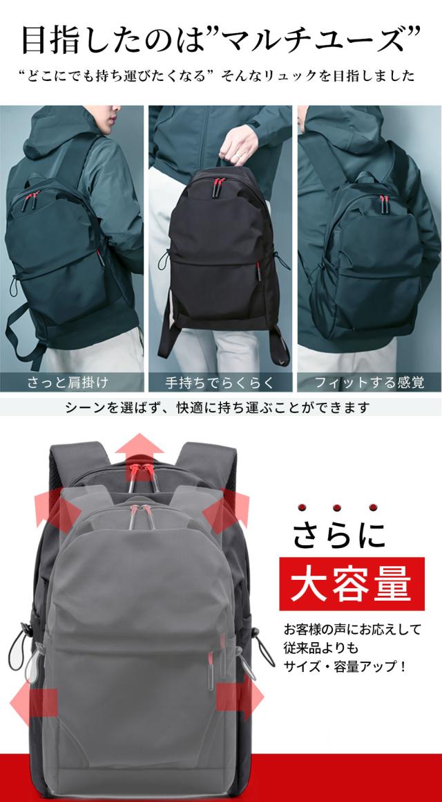 - 大容量なのにとても軽く、通勤や通学に使いやすいリュックです。パソコンもしっかり収納でき、防水仕様なので雨の日でも安心して使えます。