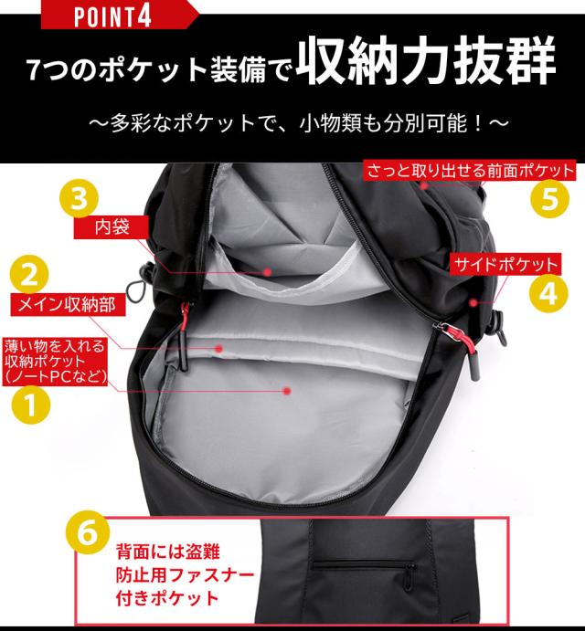 - パソコン収納がしっかりしていて安心感があります。大容量なのに軽く、肩への負担も少ないので長時間背負っても疲れにくいです。