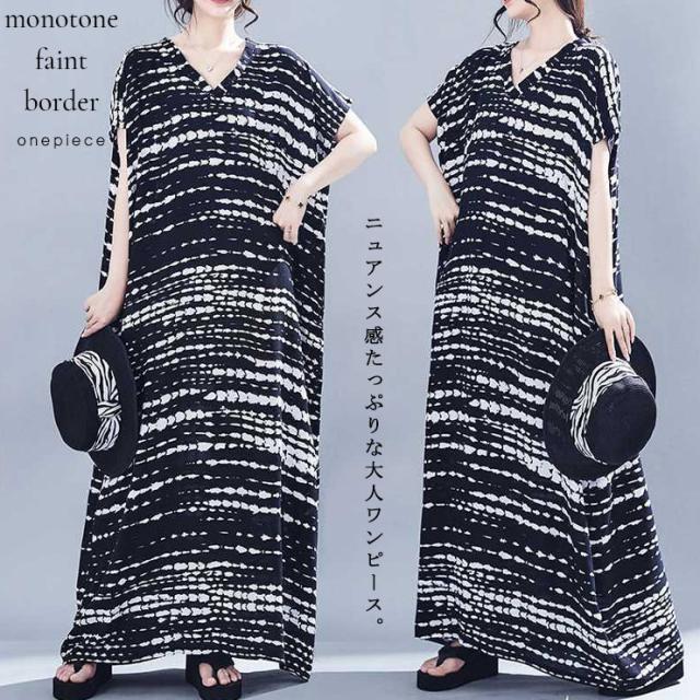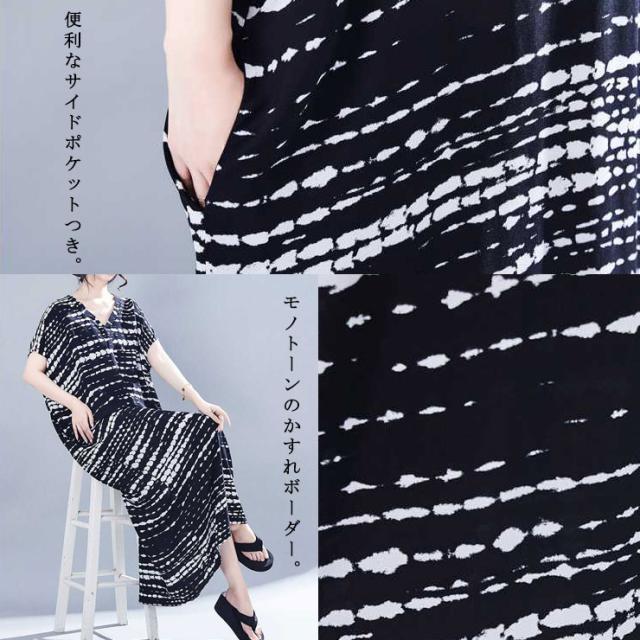 ワンピース 白黒 レディース ボーダー柄 マキシワンピ Vネック 大きいサイズ (71759)