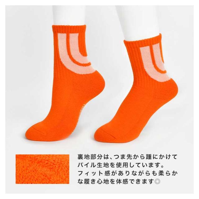 3色セットのクルーソックス。 後ろ側には大きく『Uロゴ』がデザインされているのでコーディネートのアクセントとして活躍します。 裏地の足裏部分はパイル生地になっているので優しい履き心地が体感できます。 ユニセックスで着用できるのでお揃いにするのもオススメです。