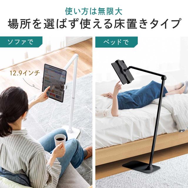 iPad タブレット フロアスタンド アームスタンド 4〜13インチ対応 床置設置 高さ調節可能 360度回転 寝ながら ベッドサイド 動画配信 サイネージ ブラック ホワイト[100-MR200]