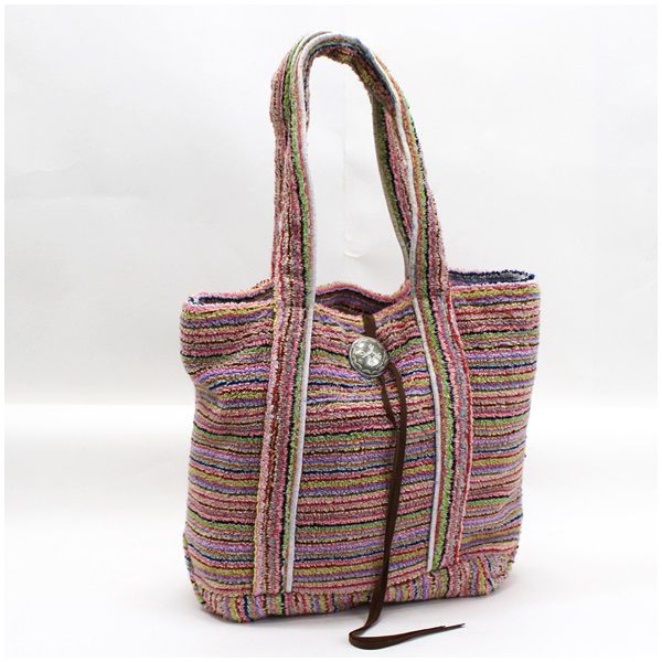 状態 アフタービーチウェアとして誕生したレディースアパレルブランド。工場で製品を作る際にでる、廃棄にされていた上質なコットンを使用しています。 【状態】【外側】・表面 糸の飛び出しなど僅かな使用感・角・縁 目立つダメージなし・金具 目立つダメージなし・持ち手 若干の薄汚れと糸の飛び出し少し【内側】上部と底部シミあり 【特記事項】若干使用感はございますが大きく目立つダメージなくまだまだお使い頂けます。 【仕様】リボン&コンチョ式開閉内側/オープンポケット1 ★こちらの商品はネコポス対応で送料無料ですが、ポスト投函となります。配送に3〜7日かかります。★宅急便をご希望の場合は、備考欄に「宅急便希望」とお書き添え下さい。また、送料800円が別途掛かりますので、ご了承下さい。