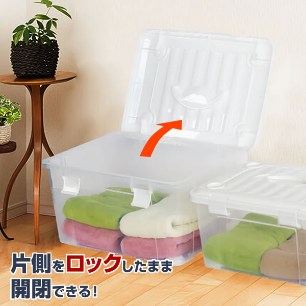 開閉ラクラク一辺をロックしたままフタを開閉できます。 フタは開いた状態で止まるので、収納作業ラクラク。
