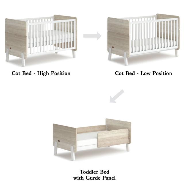 床板の高さは二段階調整。新生児から最上段で使い始め、掴まり立ちをする頃に最下段へ組み替えます。その後は2歳頃から前後柵・妻枠上部を取り外し、妻枠上部を床板に取り付けることでよりキッズベッドらしくお使いいただけます。成長に合わせてベッドを組み替えることで、より長く家具として使うことが可能です。カラーはスカンディナヴィアスタイルなホワイトオークで、流行のインテリアによくあうデザインです。