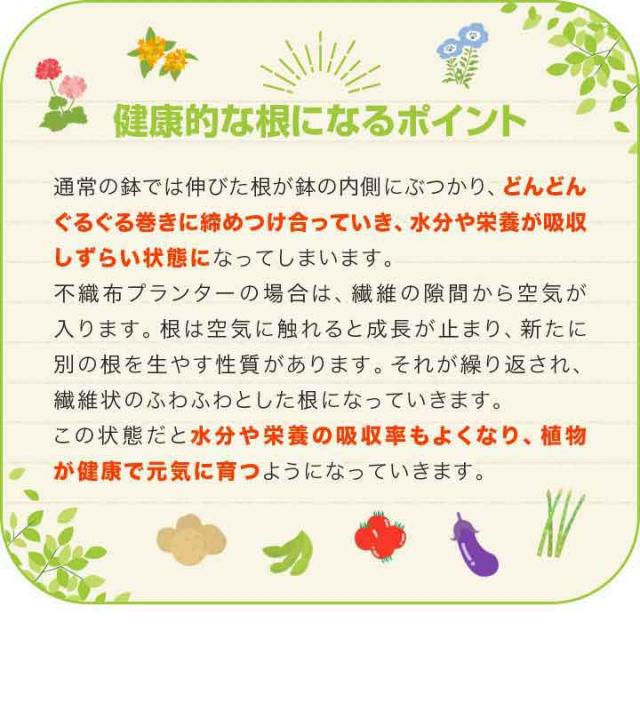 - 初めての野菜づくりに挑戦しようと不織布プランターを購入しました。早い対応で嬉しい驚きです。 思っていた以上に丈夫そうです。 色々育ててみます。有り難うございました。