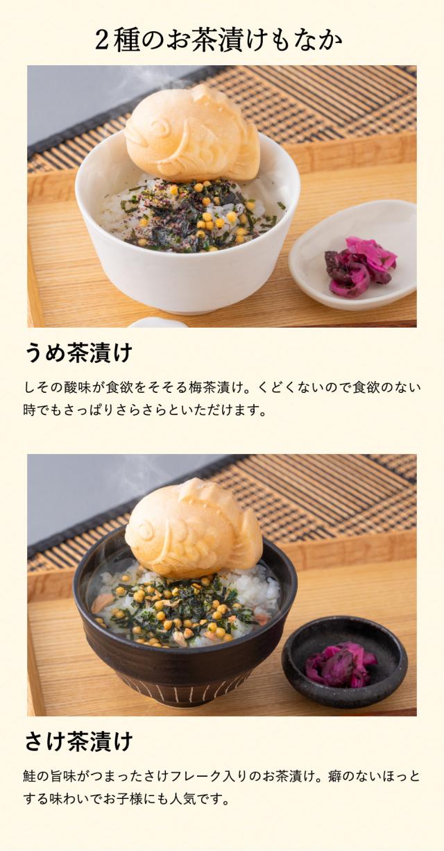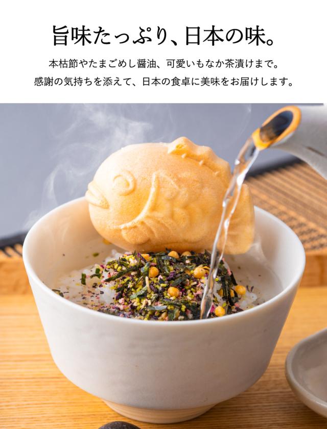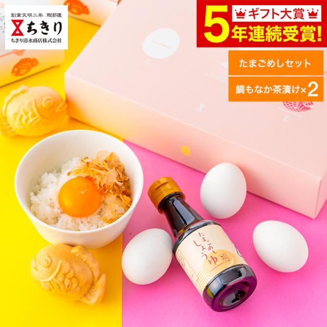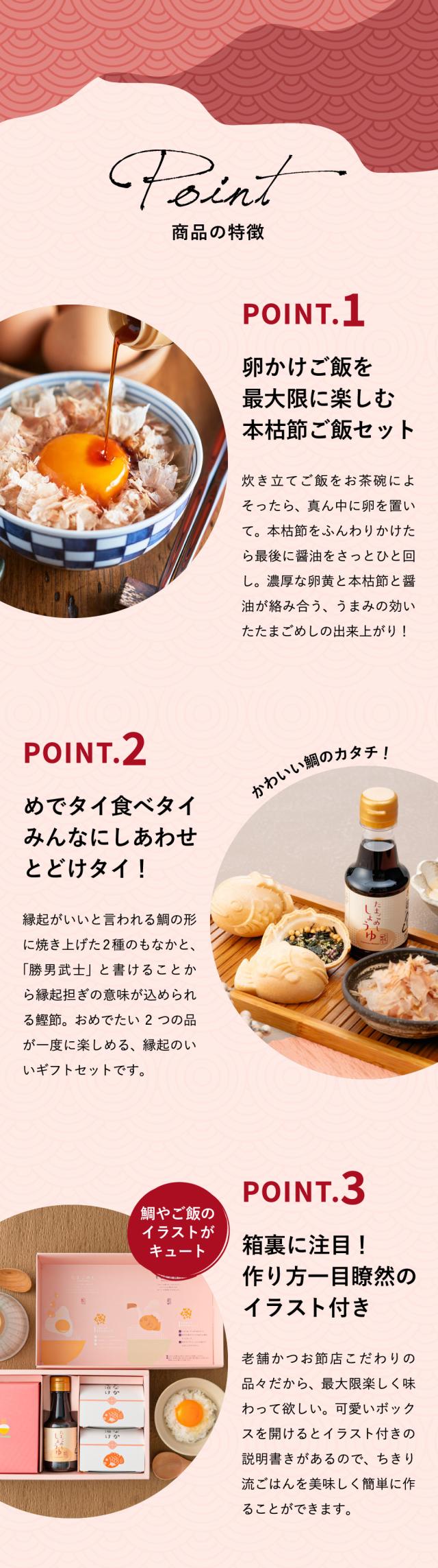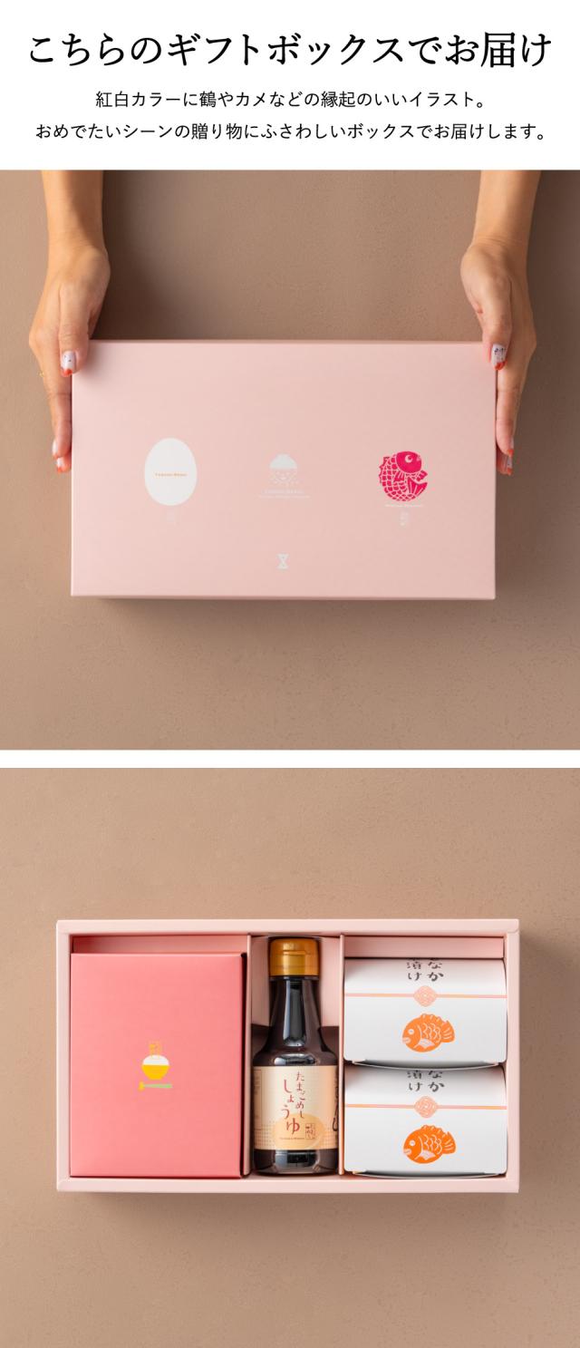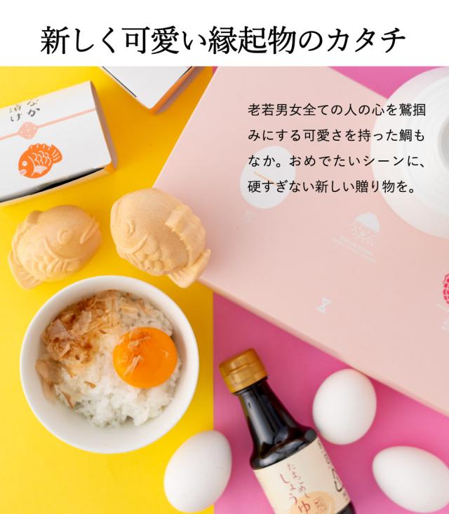 パステルカラーの可愛らしいパッケージに、「たまごめし」をおいしく食べる風味豊かな本枯節かつおパック、かつおとさばのだしが利いたたまごめし醤油、そして2種類の鯛型もなか茶漬けを詰め合わせました。