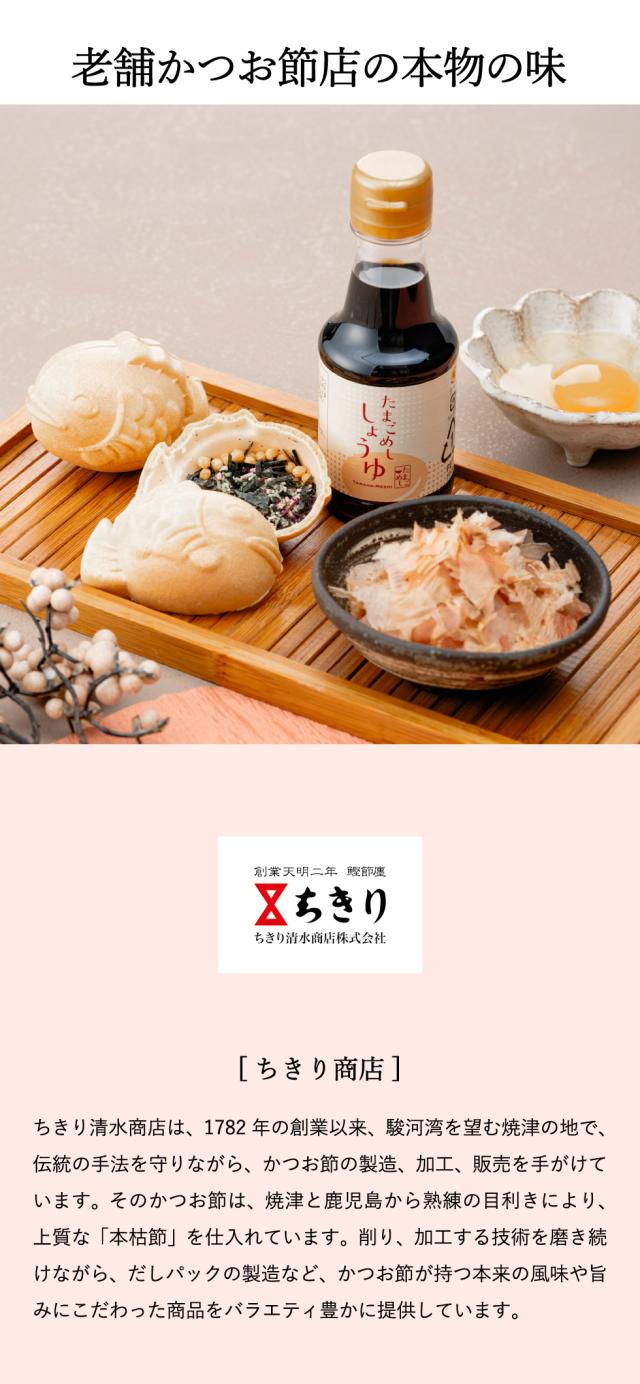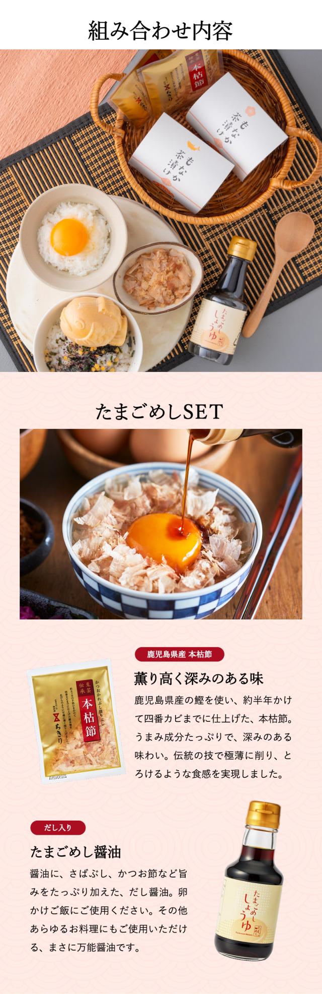 ●内容量:本枯節かつおパック2g×6袋、たまごめししょうゆ150ml×1本、もなか茶漬け(うめ・さけ)9.5g×各1個