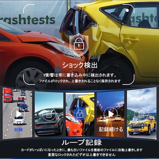 衝撃録画(Gセンサー):Gセンサーを内蔵されており、強い振動など衝撃を検出した場合は自動的に衝撃録画データとして記録して、ファイルがロックされます。