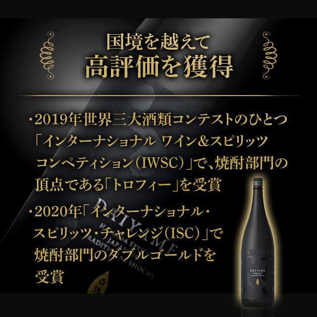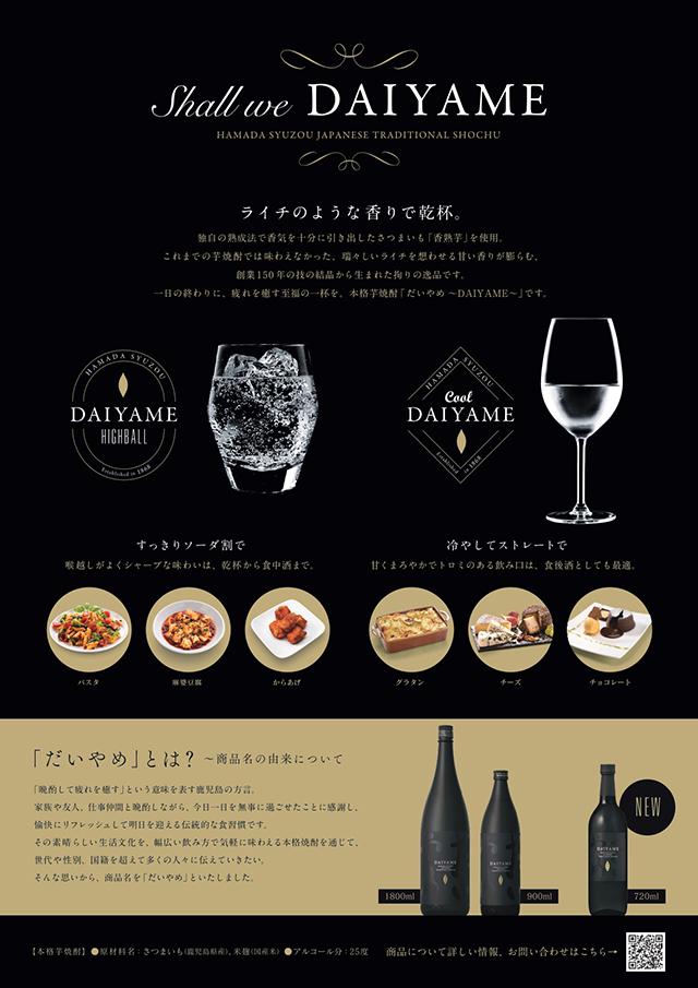 ・だいやめハイボール:炭酸割りにすることで料理の脂をすっきりと洗い流し、後口もサッパリ。味付けの濃い料理との相性も良く、特に、食前、食中酒としておすすめ。