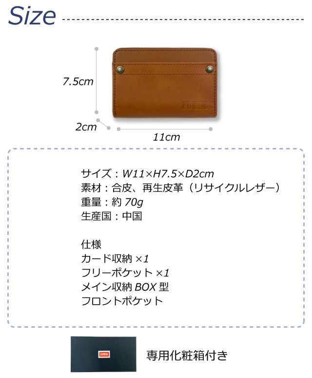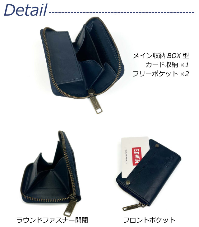 ![]() ![]() ![]() ![]() ![]() ![]() ・ EDWIN(エドウィン) ロゴが刻印されたリベットがおしゃれ。リサイクルレザーを使用した環境にも優しいラウンドファスナー小銭入れです。 シンプルで飽きのこないデザインは、幅広い年代の方に愛用していただけます。