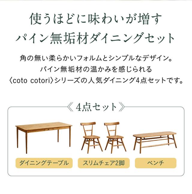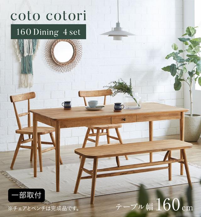 ダイニング4点セット cotocotori(コトコトリ) 幅160cm ダイニングテーブルセット 食卓セット 4人掛け ダイニングテーブル ダイニングチェア ダイニングベンチ 引出し付テーブル 食卓 無垢材 木製 ナチュラル おしゃれ