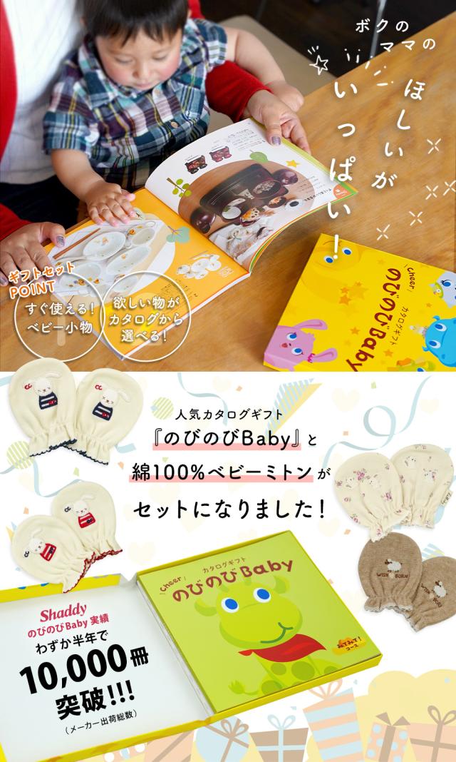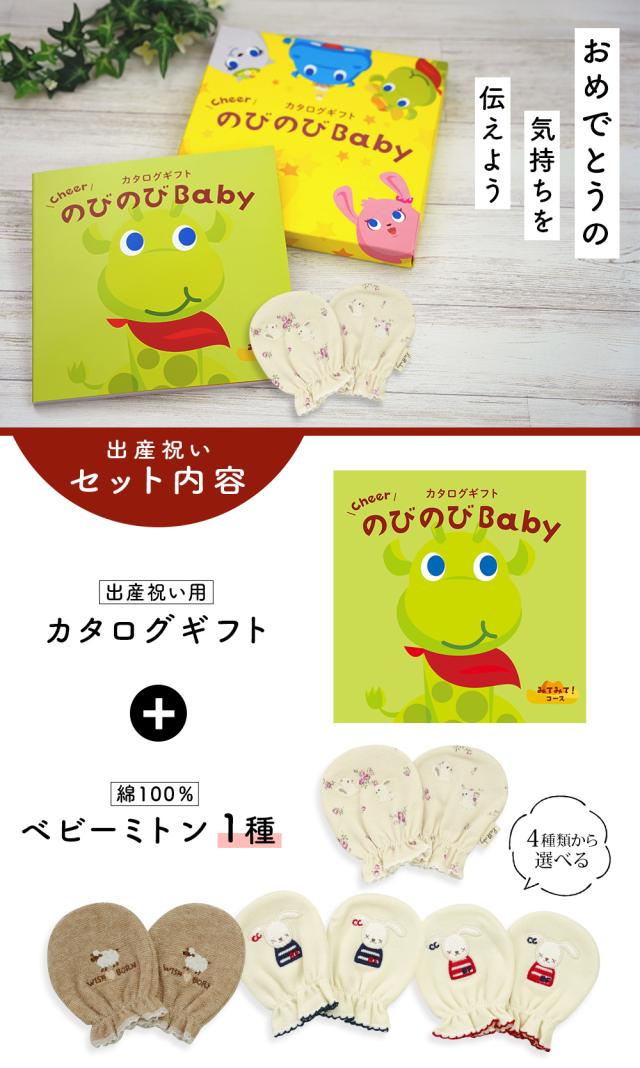 出産祝い カタログギフト のびのび Baby みてみて!コース& ミトン セット<新作商品>【ベビーミトン 4種から選べる 日本製 御祝 御祝い お祝い 男の子 女の子 赤ちゃん ベビー 育児グッズ 友達 人気 ギフトセット 手袋 ビセラ シャディ】
