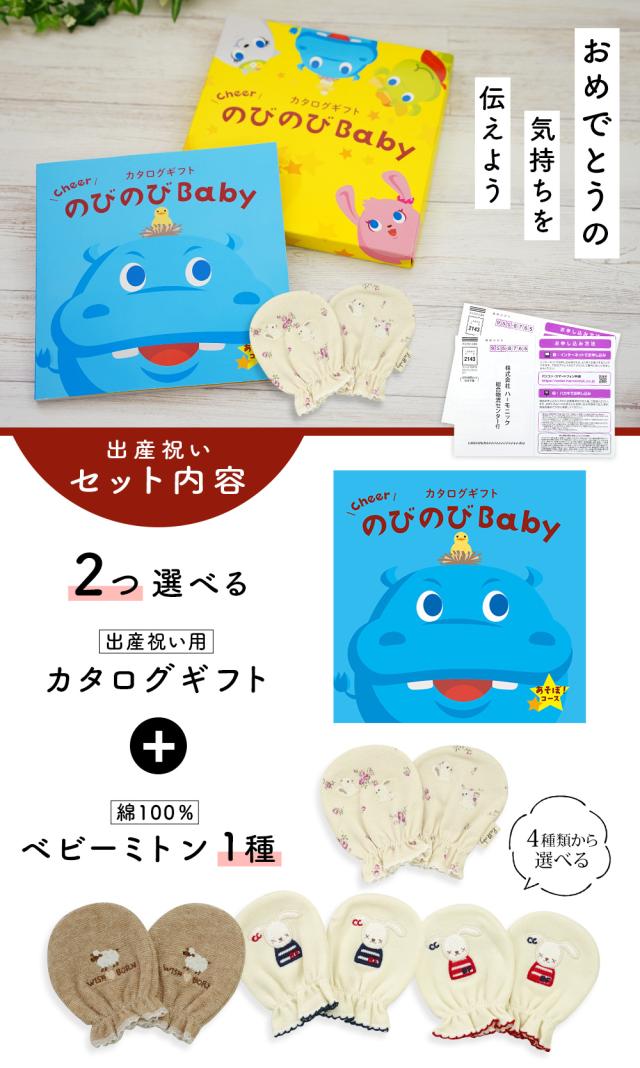 出産祝い カタログギフト のびのび Baby 2つ選べる あそぼ!コース& ミトン セット<新作商品>【ベビーミトン 4種から選べる 日本製 御祝 御祝い お祝い 男の子 女の子 赤ちゃん ベビー 育児グッズ 友達 人気 ギフトセット 手袋 ビセラ シャディ】