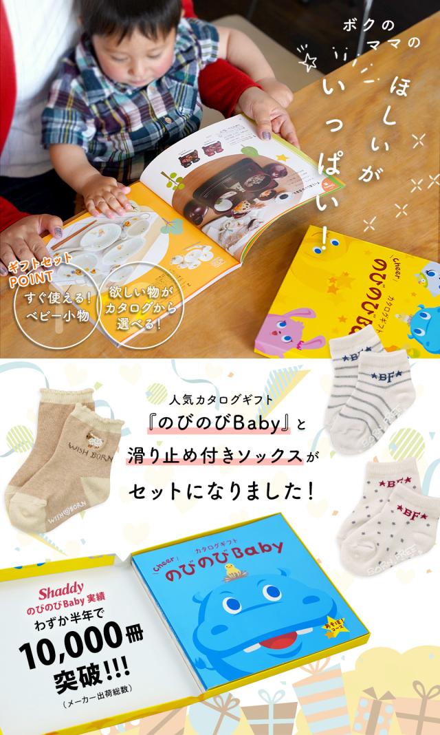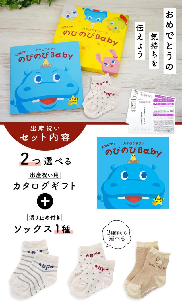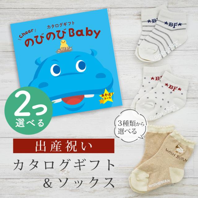 出産祝い カタログギフト のびのび Baby 2つ選べる あそぼ!コース&ソックス セット<新作商品>【靴下 3種から選べる 11cm 12cm 13cm 日本製 御祝 御祝い お祝い 男の子 女の子 赤ちゃん ベビー 育児グッズ 友達 人気 ギフトセット ビセラ シャディ】