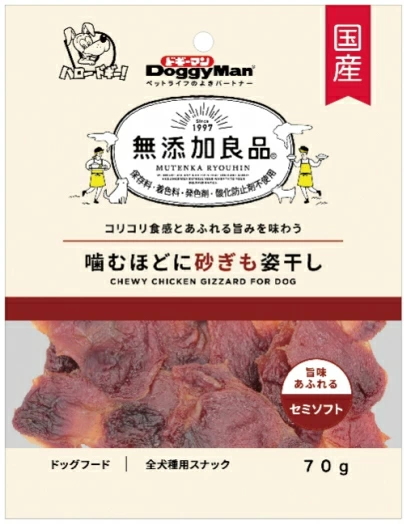 4976555826951鶏肉の中で最も低カロリーの砂ぎもを使用。噛むたびに旨みが広がるセミタイプのおやつです。気になる添加物は使わない、おいしい素材感。