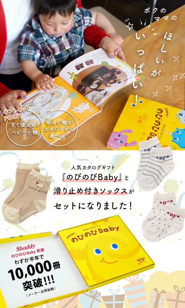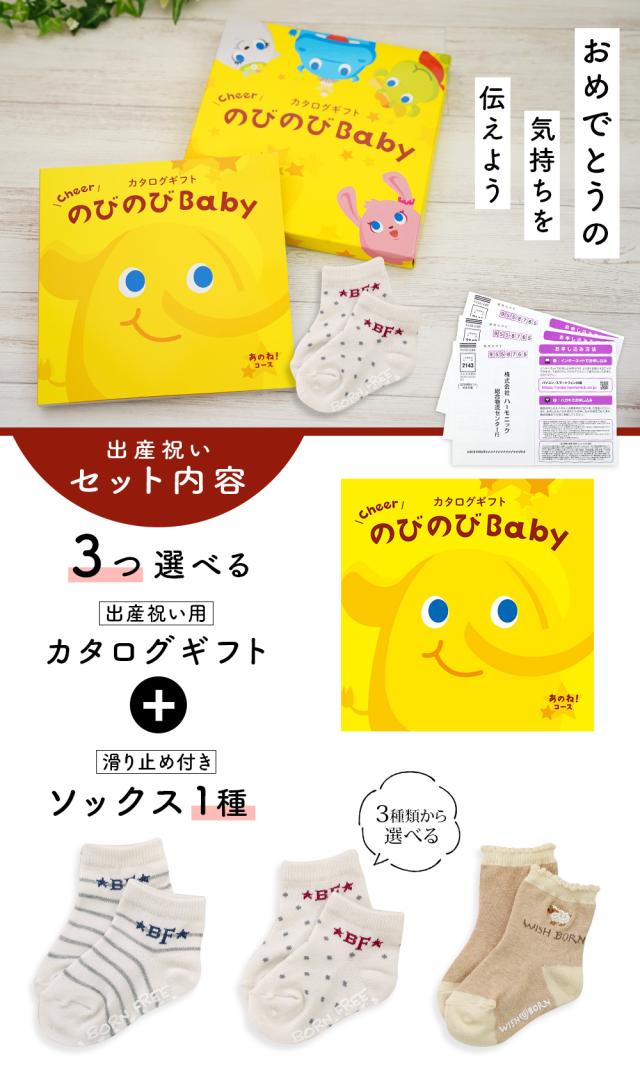 出産祝い カタログギフト のびのび Baby 3つ選べる あのね!コース&ソックス セット<新作商品>【靴下 3種から選べる 11cm 12cm 13cm 日本製 御祝 御祝い お祝い 男の子 女の子 赤ちゃん ベビー 育児グッズ 友達 人気 ギフトセット ビセラ シャディ】