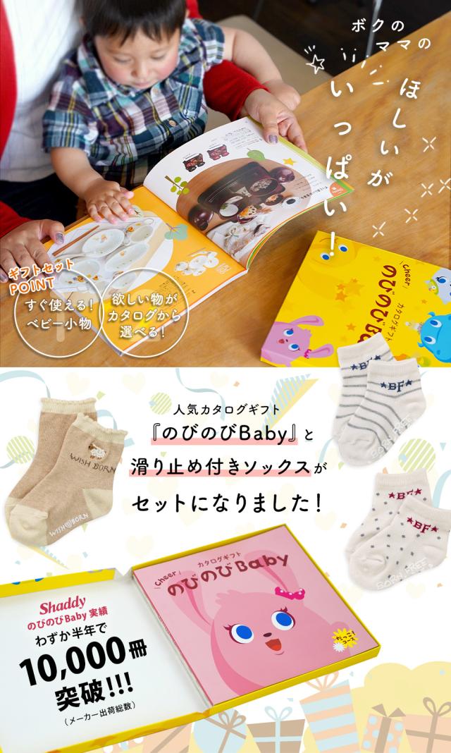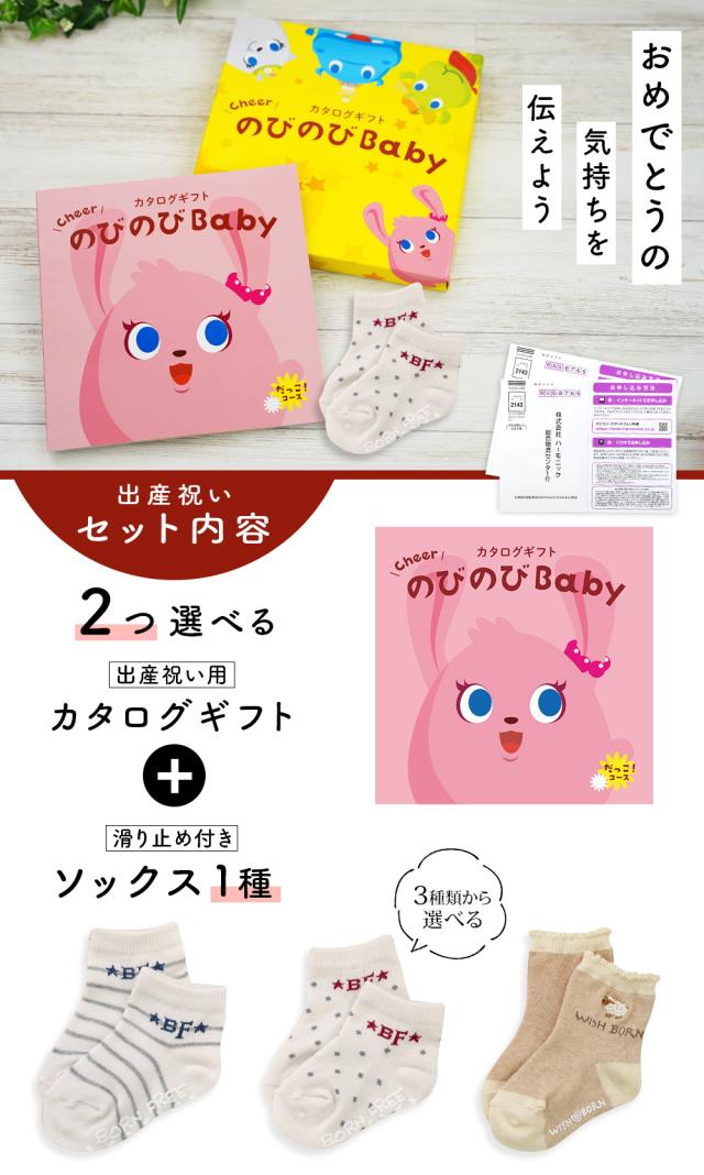 出産祝い カタログギフト のびのび Baby 2つ選べる だっこ!コース&ソックス セット<新作商品>【靴下 3種から選べる 11cm 12cm 13cm 日本製 御祝 御祝い お祝い 男の子 女の子 赤ちゃん ベビー 育児グッズ 友達 人気 ギフトセット ビセラ シャディ】