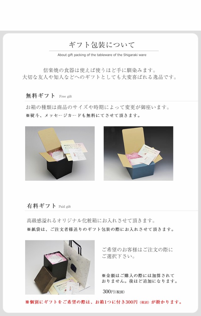 | ギフト包装 | ギフト包装、のし、メッセージカードは無料にてさせて頂きます。 ご注文時に備考欄にお書き下さいませ。 また有料ギフト包装をご選択頂くことも可能です。 無料ギフト包装と有料ギフト包装の違いは、お箱のみとなり、 無料ギフト包装は段ボール箱、有料ギフト包装は化粧箱となります。 ※有料ギフト包装代金に関してはお箱1つに付き料金が発生いたします。 食器を2点ご購入で、1つの有料化粧箱にお入れの場合は、 1点目のご注文を「有料ギフト包装」、2点目を「無料ギフト包装」をご選択の上、 ご注文時の備考欄に「一緒に箱入れ希望」の旨、ご記載頂きます様、お願い申し上げます。 |
