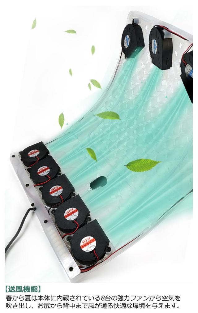 | 【優れたデザイン】3D立体シートで自宅のソファに座っている感じで長い時間で座っても疲れない!ワンサイズのデザインは、どれくらいの長さのドライブでも快適にお使いいただけます。 【通気性抜群】厳選されてメッシュ素材と強力ファンの組み合わせで通気性抜群、暑い夏に熱を解消することも、冬に保温することもできます。 【送風機能】春から夏は本体に内蔵されている8台の強力ファンから空気を吹き出し、お尻から背中まで風が通る快適な環境を与えます。 【高速回転&静音】強力ファンを5台内蔵しており、高速回転で除熱効果抜群。ファン回転静音設計で静かに快適な運転時間を楽しめます。 【操作しやすい】電源スイッチを押すと風力弱モードが運転し、三つの風力モードを気軽に切り替えます。使い勝手が抜群です。 【省エネ・健康】付属のUSBケーブルをUSB電源口に接続して簡単に使用できます。PC、アダプター、モバイルバッテリ、コンセントなどを利用して手軽く冷風機扇に給電しながら使用できます。 | |