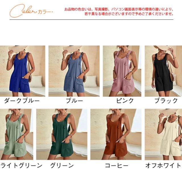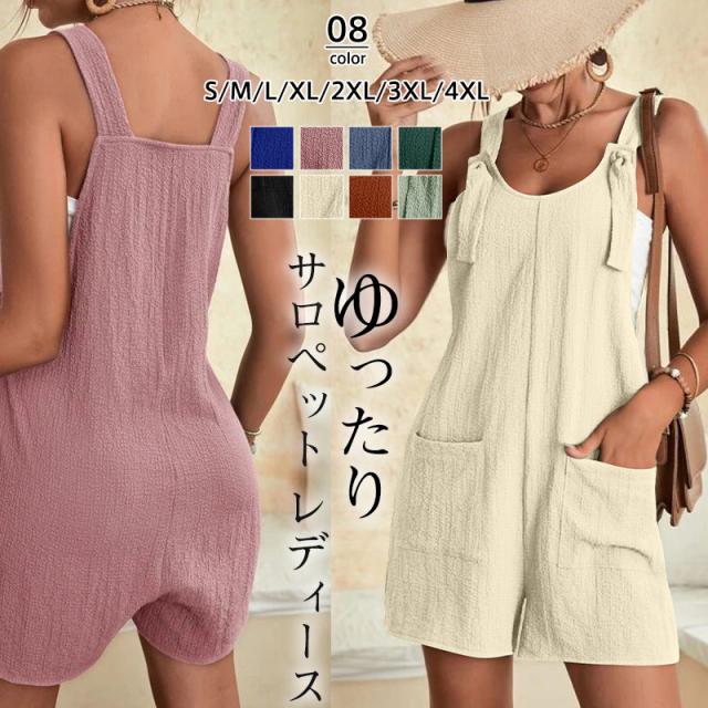 サロペット レディース オールインワン オーバーオール ショート丈 リネン風 カジュアル 大きいサイズ 無地 着痩せ 薄手 春 夏