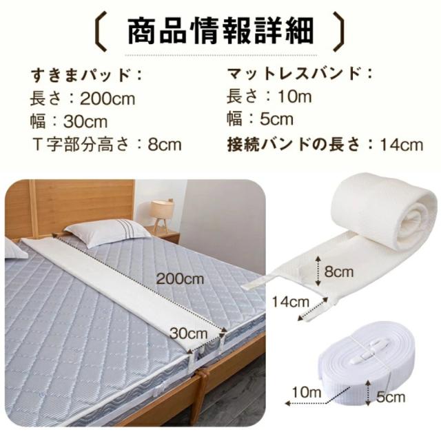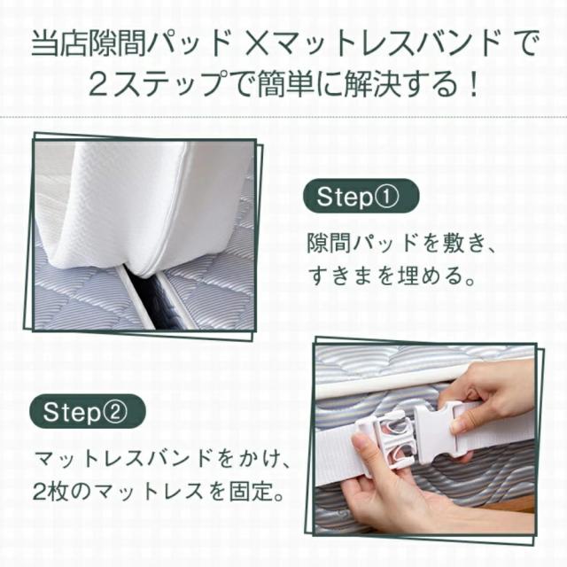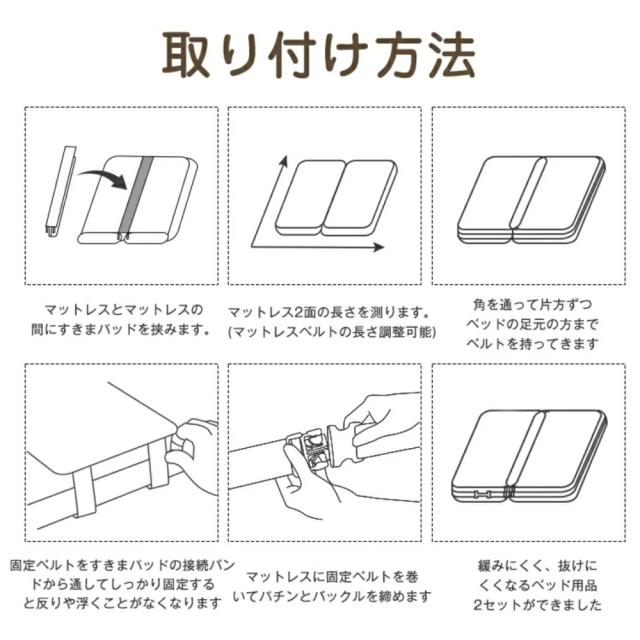 【良い眠りライフへ】隙間を埋めるすきまパッドとマットレスを離さない固定ベルトがセットになることで、2枚のマットレスをしっかり固定し、真ん中の隙間問題を解消し、安心的に眠れます。