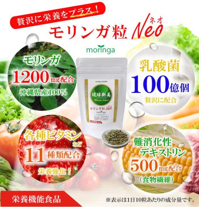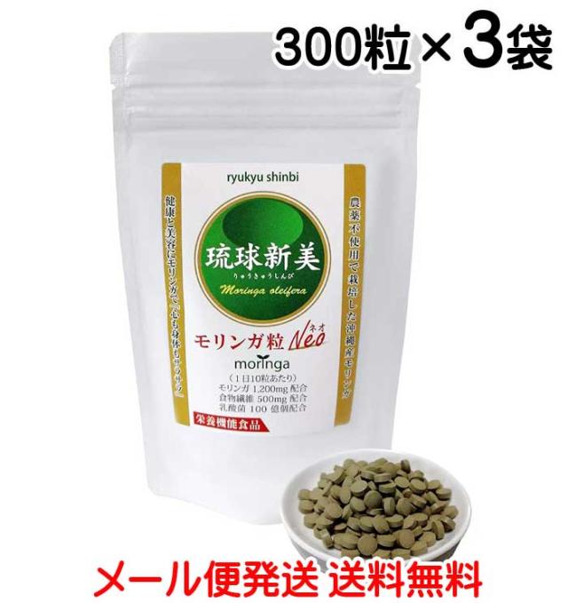 無農薬栽培 琉球新美 モリンガ粒Neo(ネオ)300粒×3袋 栄養機能食品〔メール便送料無料〕沖縄県産モリンガ 食物繊維 乳酸菌配合