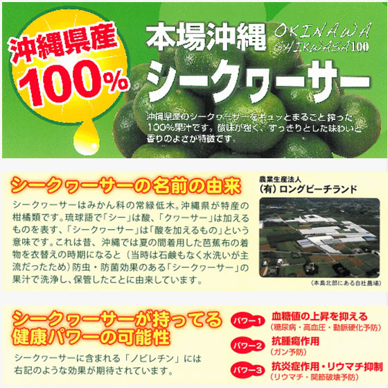 沖縄県産のシークヮーサーをギュッとまるごとしぼった100%果汁で、酸味が強く、スッキリした味わいです。 テレビや健康雑誌で注目の高いシークヮーサー果汁には、ノビレチンという成分が多く含まれております。 軽量なPETボトルタイプなので便利です。 |