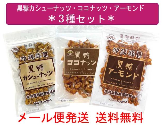 黒糖 アーモンド ・ 黒糖 カシューナッツ ・ 黒糖 ココナッツ 3種 セット 沖縄産 ・ 多良間島産 黒糖 使用 メール便 発送 送料無料 クラッシュ アーモンド ナッツ お菓子 ポイント消化 お試し 垣乃花