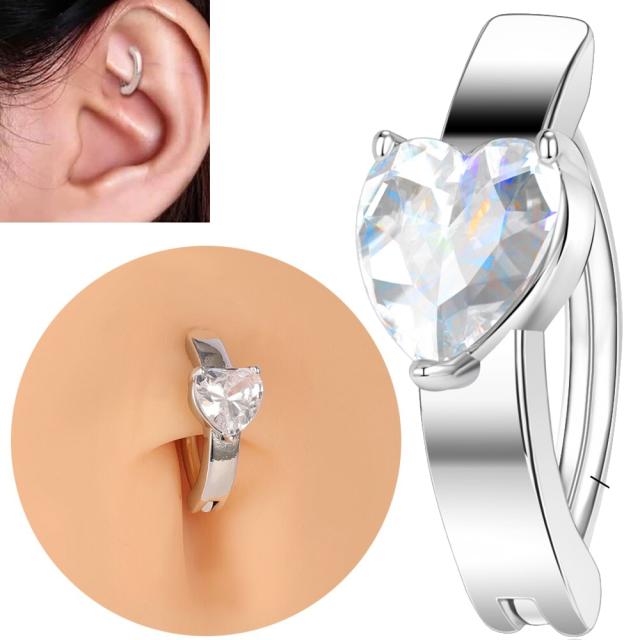 ハート型の透明クリスタルのキュービックジルコニアをセットした14ゲージのオーバルクリッカー型ボディピアス。